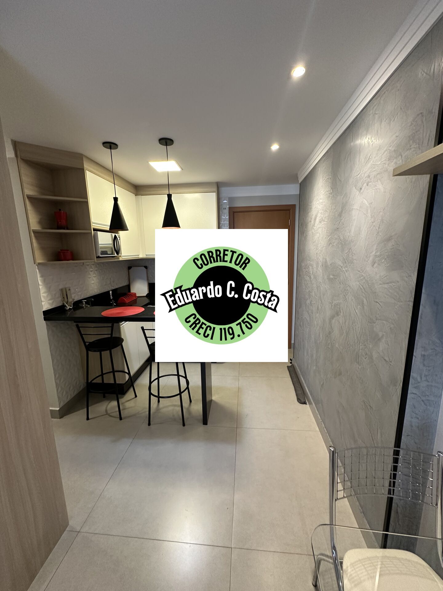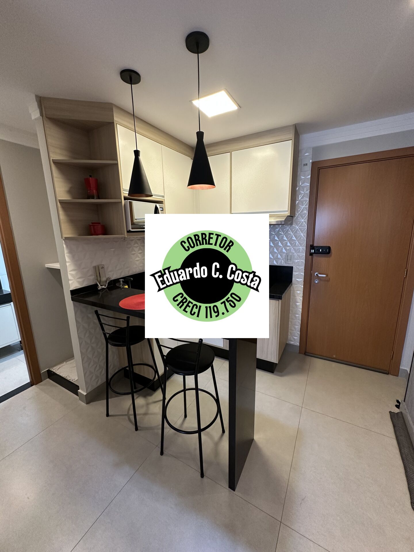 - Cozinha: Compacta e bem equipada, conta com armários planejados, cooktop de indução elétrico, micro-ondas, geladeira e balcão, proporcionando praticidade para o dia a dia.